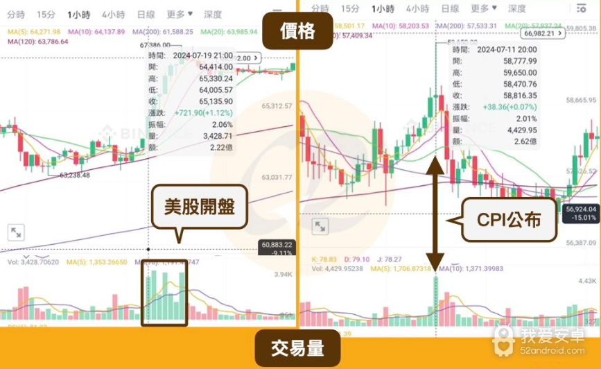 当美国发布重要经济数据时,比特币的交易量也会出现显著增加。如图中的箭头显示,7月11日晚8:30发布CPI数据时,比特币的交易量和价格波动都有明显的反应。
